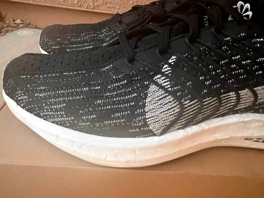 L’empeigne de la Nike Pegasus Turbo Next Nature est bizarre. Elle ne ressemble pas à une chaussure de running, mais plutôt à une chaussure décontractée et de style de vie. C’est très bien, sauf qu’elle ne respire pas bien. Je vis dans le désert de Mojave et je peux vous dire que ce n’est pas ma chaussure préférée pour l’été. L’épaisse matière Flynit est rigide et ne respire pas. On peut également voir une lueur des anciennes Turbos avec la bande de course au centre. Le noir sur le noir ne fait pas vraiment ressortir la couleur.