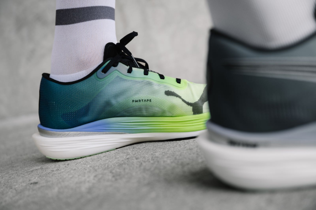 Dans la partie supérieure, Puma mise sur un mesh léger et flexible. Les éléments PWRTAPE assurent un bon ajustement et un certain guidage. Le contrefort du talon est également flexible, mais la chaussure de course reste bien en place. Les deux rembourrages au niveau du talon y contribuent également. Le matériau rugueux permet de ne pas glisser facilement hors de la chaussure de course. De manière générale, le confort de port est très élevé. La largeur de la chaussure de course est très bien conçue, les pieds les plus larges se sentiront en sécurité dans la chaussure.