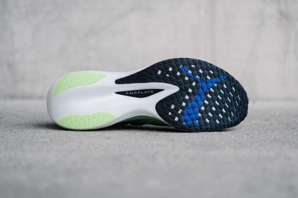 La semelle intermédiaire est composée de deux couches de Nitro Elite Foam, qui est la plus rapide de la maison Puma. Entre les deux, il y a une plaque continue en fibre de carbone. Au niveau du talon, la hauteur de la semelle intermédiaire est de 36 mm, de sorte que les 40 mm autorisés ne sont pas complètement exploités. Grâce à cette structure, les pieds bénéficient d’une bonne stabilité et la géométrie n’est pas trop agressive. La semelle extérieure est bien sûr en Pumagrip, qui compte parmi les meilleurs matériaux du marché. Ce mélange adhère toujours de manière fiable et soutient ainsi la stabilité de la chaussure de course.