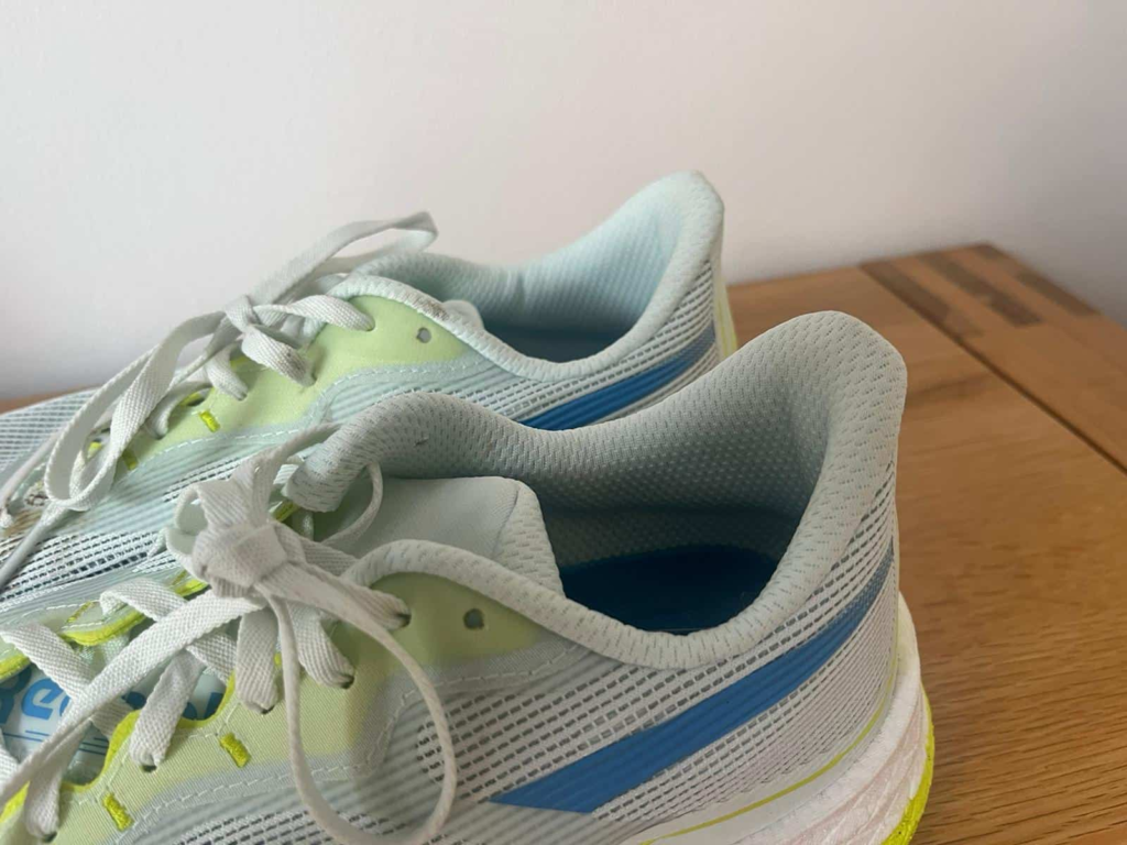 A part une usure superficielle à l’arrière de la semelle et quelques salissures (j’ai remarqué que le mesh plus large de l’Energy 3 attrape un peu plus de gravier et de boue que d’autres modèles de tige, comme sur la Hoka Rincon 3), les chaussures ne montrent pas vraiment de signes d’usure.