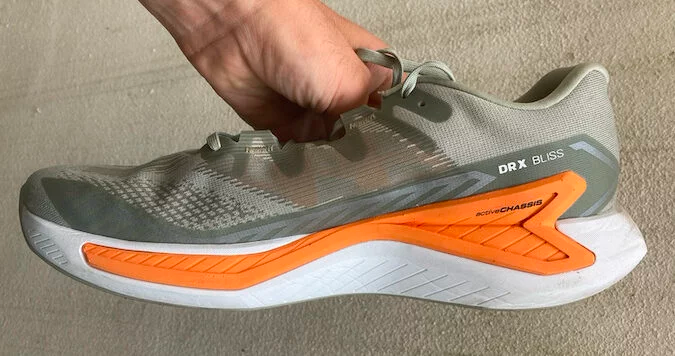 L’Active Chassis est définitivement une caractéristique très proéminente de la chaussure. Dans ma version de test, l’énorme bande orange coupe en deux la semelle intermédiaire et est très apparente. J’ai vraiment senti que les caractéristiques de stabilité de la DRX Bliss guidaient mon pied. Maintenant, en tant que coureur qui utilise peu de chaussures de stabilité, je ne suis peut-être pas la bonne personne pour parler de la façon dont elles corrigent mon attaque de pied.